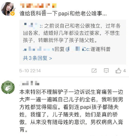 知名网红papi酱近期生了个孩子,当得知她的孩子是跟随父姓的时候,某网友出来挑刺了。