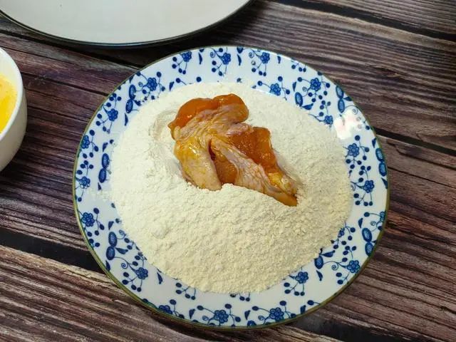 4、把腌制好的鸡翅根取出,放在炸鸡裹粉中翻滚几下,让翅根表面均匀地裹上裹粉。