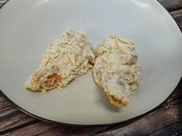 6、最后再放入裹粉中,翻滚揉搓几下,这个时候翅根表面会出现粗糙的鱼鳞状,炸鸡裹粉的步骤就做好了。