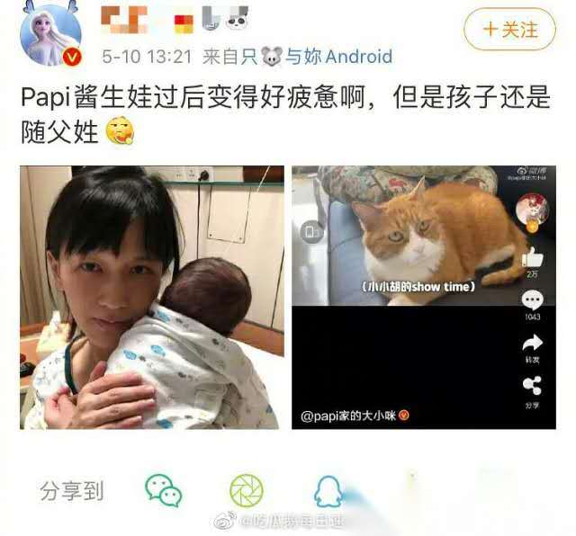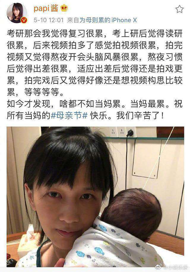 5月10日母亲节,初为人母的Papi酱在社交平台上晒出了和宝宝的合照。
