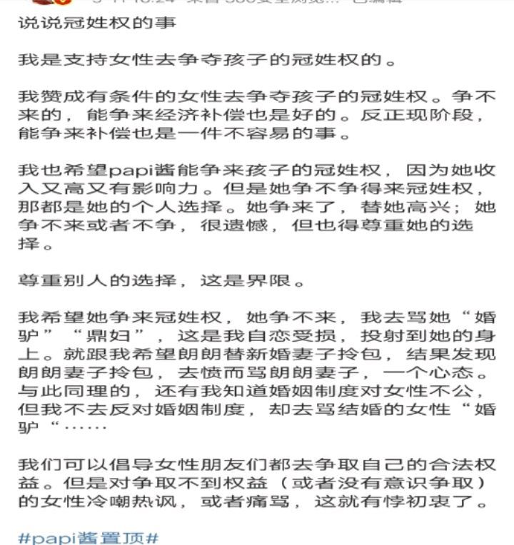对于papi酱孩子跟父亲姓的事情,部分网友认为,papi酱作为独立女性,孩子跟父亲姓就是独立女性人设的崩塌(诡辩)。