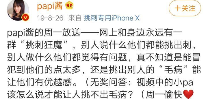 papi酱因孩子随父亲姓一事引发网友热议,随后,papi酱在微博置顶了于2019年8月26日发布的微博,“网上和身边永远有一群‘挑刺狂魔’”。微博中的视频封面为:“如何说话不被挑刺”。