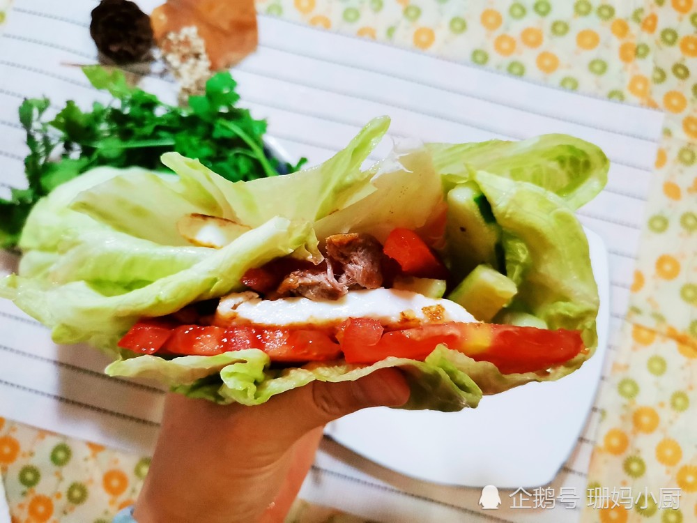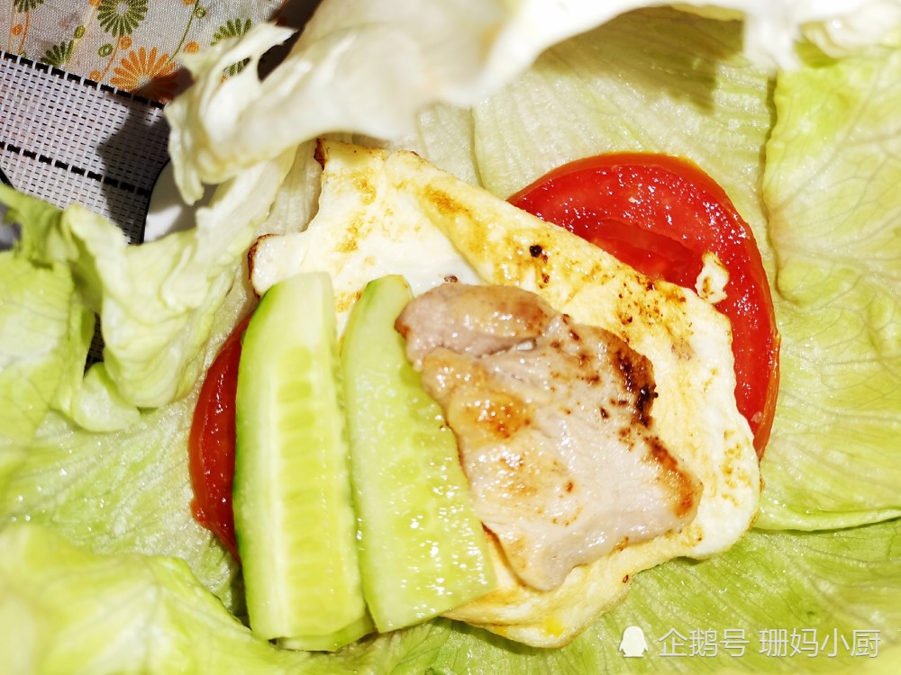 再放入青瓜和鸡肉片,压在鸡蛋上,再压上两片西红柿,将生菜叶卷起。注意啊,整个三文治,不放油,不放沙拉酱的啊。
