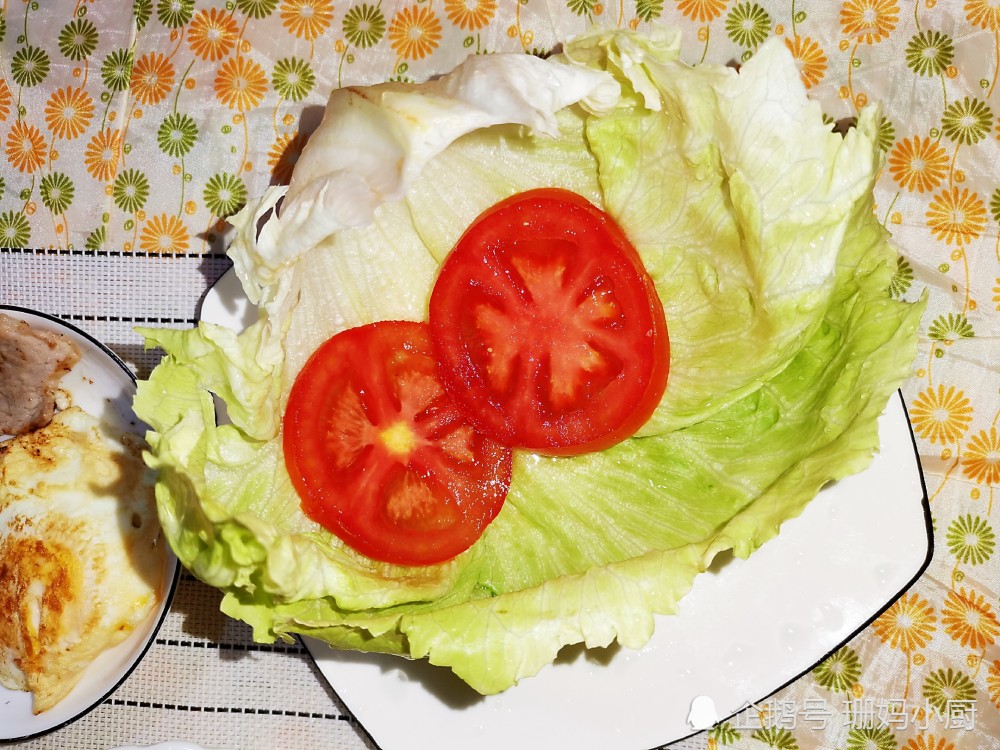生菜整片掰下来,清洗干净;西红柿和青瓜分别用盐搓洗干净,将西红柿切成薄片,青瓜削去外皮,切成薄片。生菜用卷心生菜更容易包,因为卷心生菜的叶子本身就是卷成球形的。