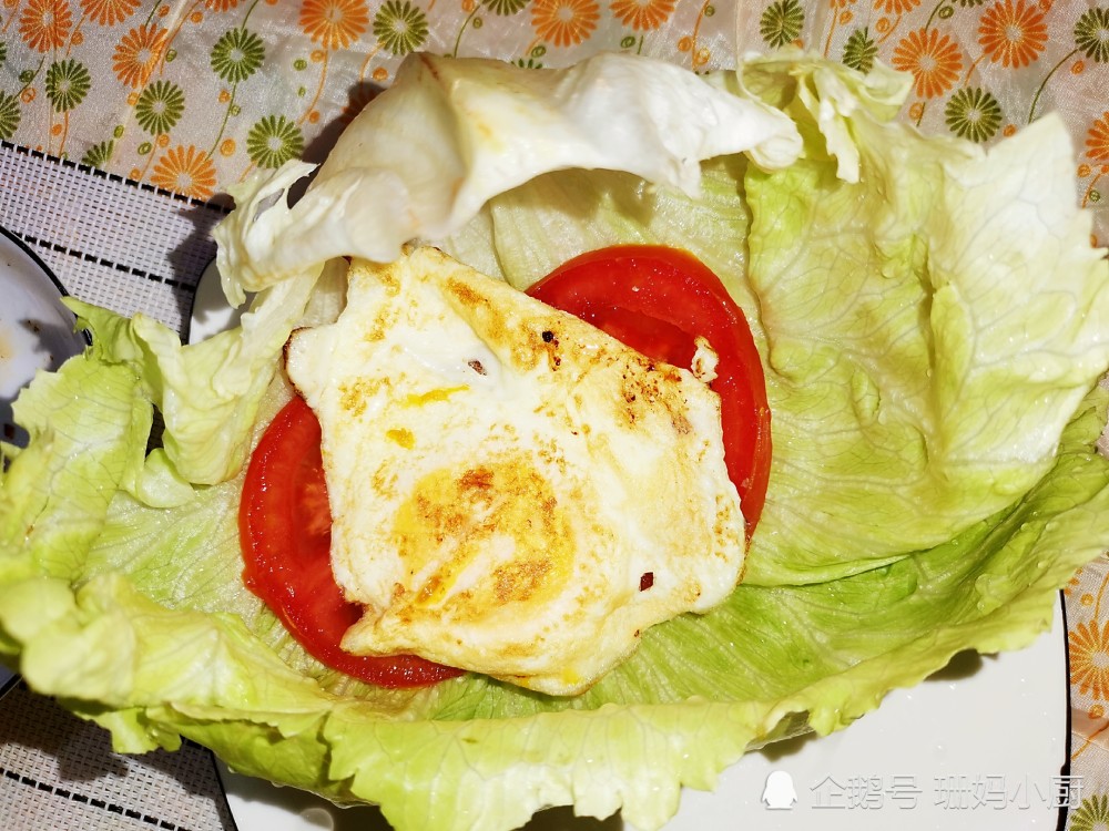 材料准备好后,就可以开始做三明治了,首先,把生菜弯曲的那一面朝上,往生菜叶子上挤上一些番茄酱,放入两片番茄,铺上煎鸡蛋。