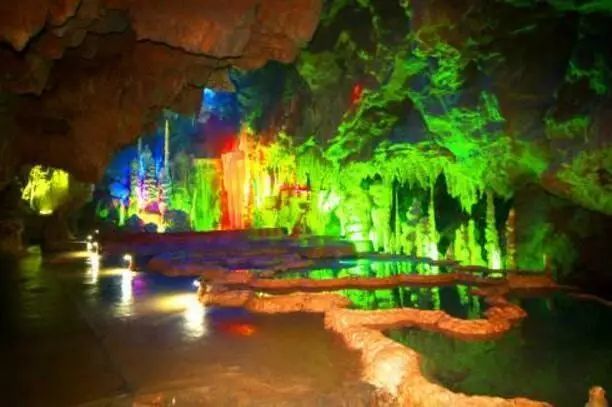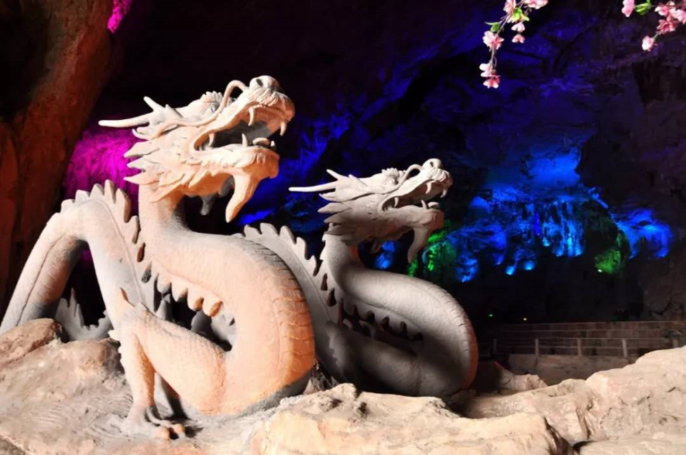 洞内钟乳石姿态万千,地下暗河清澈见底,四季恒温,龙王寝宫内瀑布从崖壁直泻而下,如雷声轰鸣,气势非凡。