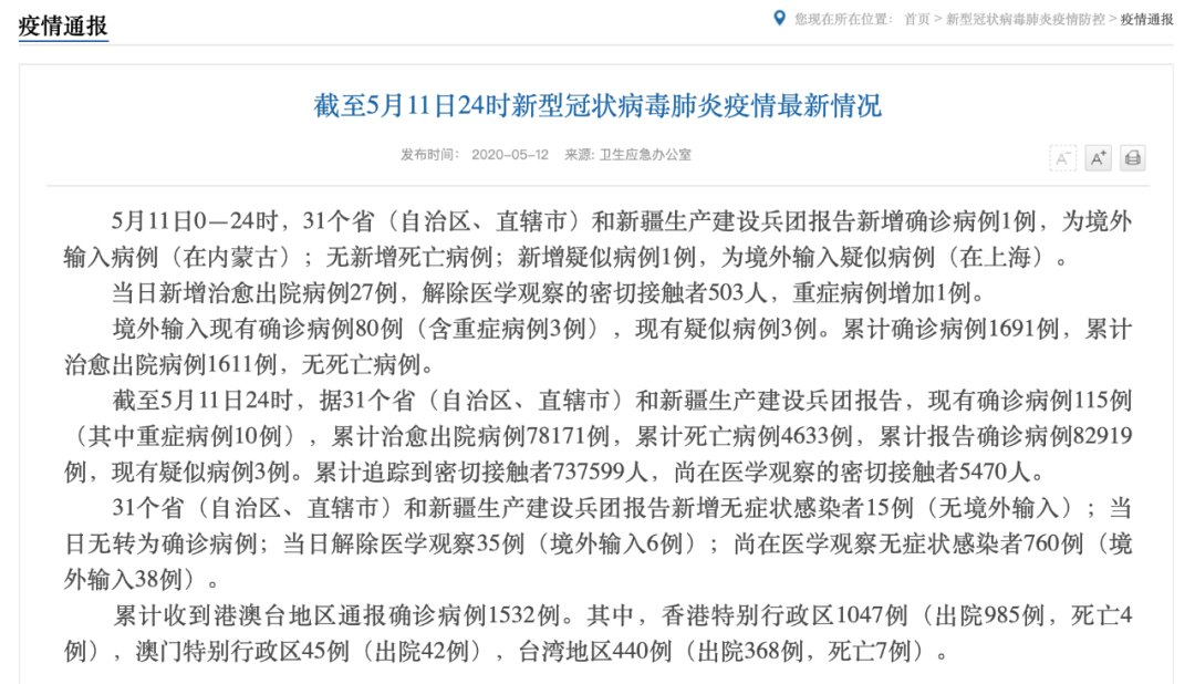 截至5月11日24时,据31个省(自治区、直辖市)和新疆生产建设兵团报告,现有确诊病例115例(其中重症病例10例),累计治愈出院病例78171例,累计死亡病例4633例,累计报告确诊病例82919例,现有疑似病例3例。累计追踪到密切接触者737599人,尚在医学观察的密切接触者5470人。