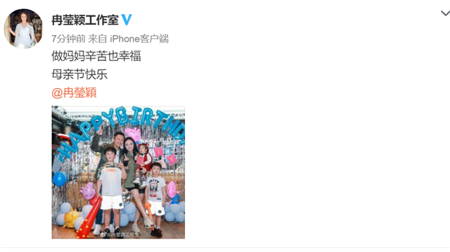 5月10日是母亲节,冉莹颖工作室发文:“做妈妈辛苦也幸福,母亲节快乐”,并晒出了冉莹颖一家五口的合照。照片中,冉莹颖抱着小儿子,大儿子和二儿子站在两边,邹市明和冉莹颖靠在一起,都开心地比着“一”,一家人看起来很是幸福。