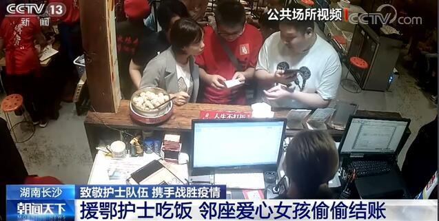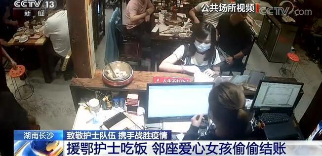 餐厅的监控画面显示,5月6日晚上7点48分,南华大学附属长沙中心医院4名护士看到完成付款的账单,既惊讶又感动。随后他们请求餐厅帮忙调取监控才发现,是同在这家餐厅用餐的一位陌生女孩帮他们买了单。原来,4名护士在疫情期间曾随湖南省第五批支援武汉医疗队前往武汉金银潭医院驰援,工作了43天后返回长沙,现已回到工作岗位。就餐期间,大家各自聊起这段经历。