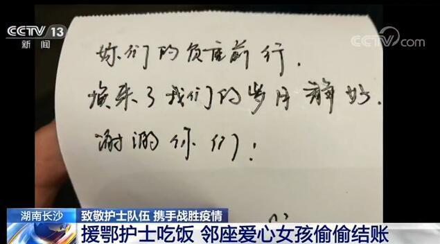 央视网消息:护士们逆行出征,白衣执甲。我们敬佩他们的逆行,也感恩他们的付出。日前在湖南长沙,就发生了一件暖心的事,4名支援过武汉的护士在吃完饭后发现,邻座的女孩悄悄为他们结了账。在小票后面,这个女孩还写下了这样的话,“你们的负重前行,换来了我们的岁月静好,谢谢你们”。我想这一声“谢谢”也代表了我们所有人的心声。