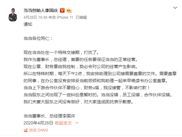 “庆渝年”大戏,在李国庆拿走公司印章后总算是暂时告一段落。4月28日李国庆通过微博向“当当同仁”进行道歉:“我们夫妻大股东之间没有做好,对大家造成困扰表示歉意。”