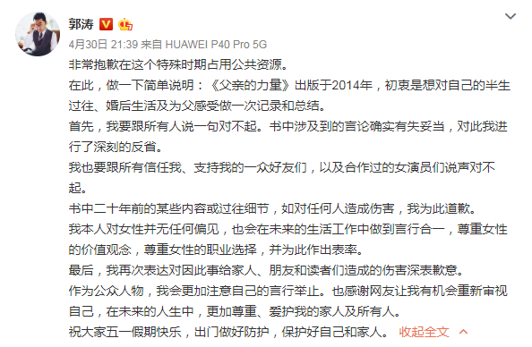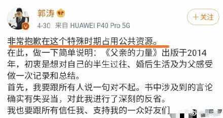随后郭涛在微博上对这件事情进行详细说明,并特别对女性进行道歉,不可谓不诚恳,这件事情的热度也就很快过去。
