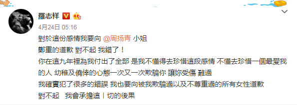 然而这份语焉不详的道歉声明并没能让这件“丑闻”热度减小,第二天一早,罗志祥再次道歉,其中向周扬青以及被“欺骗和不尊重过得女性”道歉,算是承认了周扬青的相关指控。
