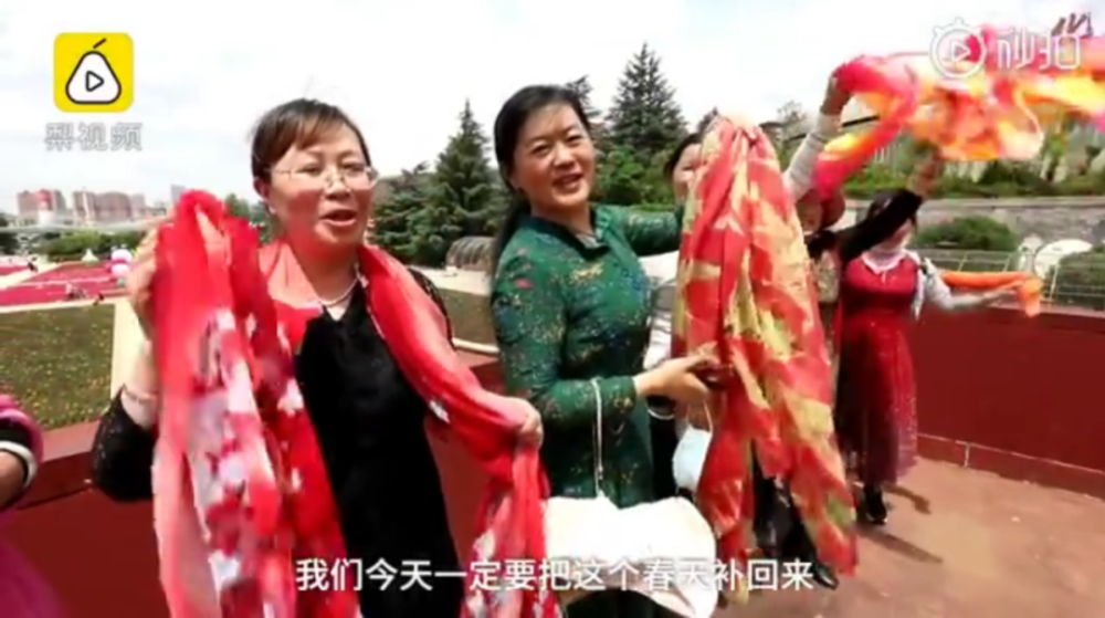 大妈们带50条丝巾到景区拍照:要把春天补回来