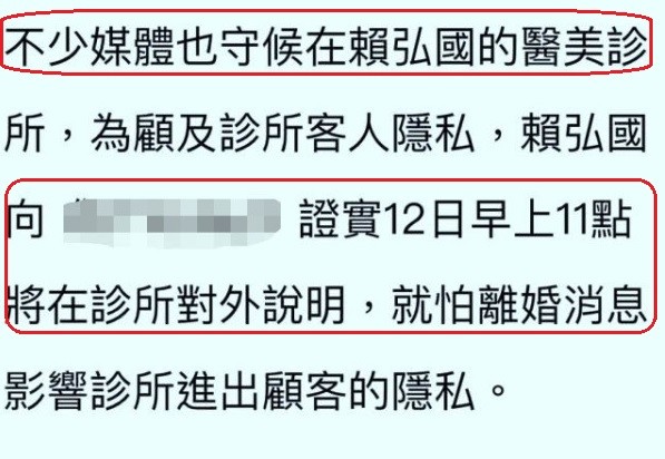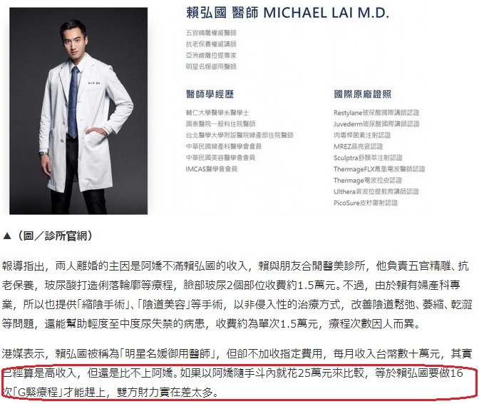 台媒表示赖弘国第一次手术可以赚1.5万元,而且手术其实有一些尴尬的存在,做一些“缩阴”和解决女性生理上的手术。并且他还被称为明星名媛们御用的医生,专业所学的就是妇科专业的医术。