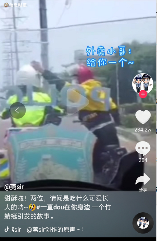 第二天上午,在抖音“东莞发布”号上,这段警民友好互动的视频一经发布就让众多网友点赞不已,“在一起在一起”、“是心动啊”、“幸福的感觉”、“后面的小哥哥酸了”、“东莞铁骑是真帅”……