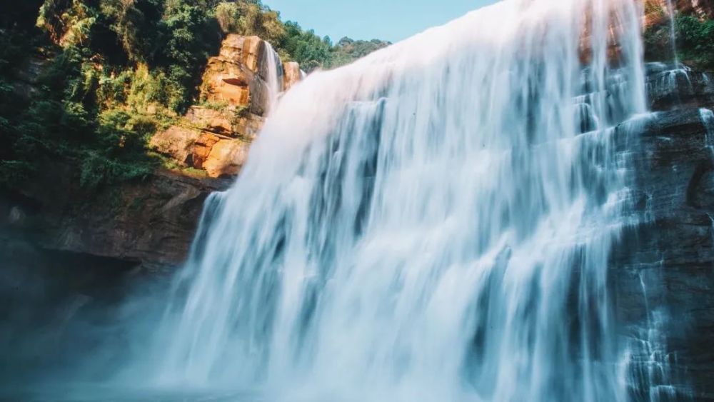 赤水山高水长,瀑布四季都有。雨季如银河垂落,旱季似银龙下山。唯有赤水大瀑布,如银幕垂坠于丹红色的山谷里。