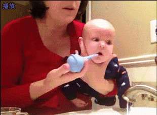 冲洗时,要让宝宝身体和头部前倾,保证鼻涕流出来。尽量保持宝宝张开嘴“啊”。下图的宝宝表现就很不错