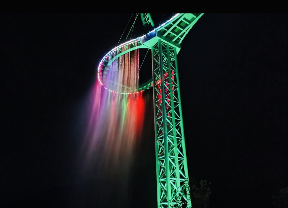 黄腾峡的玻璃桥叫做“天门悬廊”建在悬崖边,凌空往外伸出368米,造型别致,远远看去就像家里洗澡的“花洒”(淋浴头),离地面的高度有60层楼那么高,最有趣的是,这玻璃桥不单单外形像花洒,而且有着一样的功能,到了晚上,还真会喷水,配合着五彩的灯光,和音乐,从这花洒中喷出的水,从60层楼的高空落下行程一条彩色的瀑布。