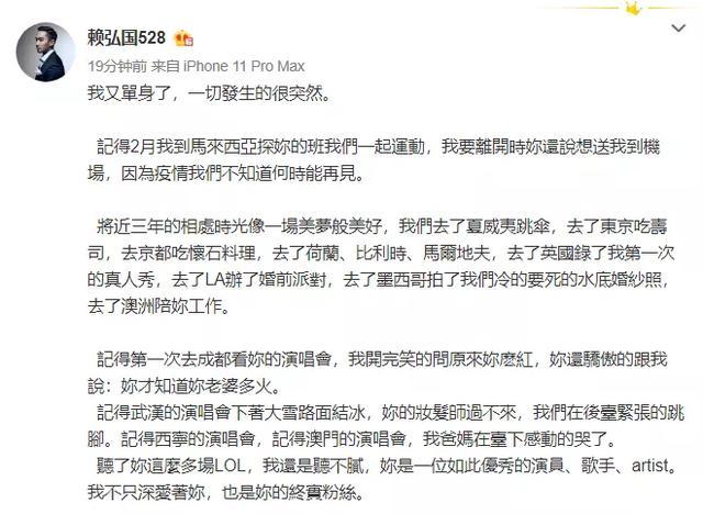 而赖弘国却不同阿娇的简短避嫌,反而发千字长文对此进行详细描述,当时他称单身的太突然,在三年的相处时光中和阿娇做了很多事,没想到之后却只收获到“不爱”和“不适合”,对此他现在也不能走出来。