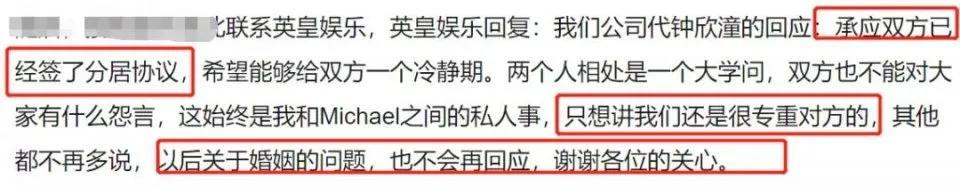 其实,在网上曝出两人离婚当天,就都对此进行过回应,阿娇通过公司证实签署了分居协议准备离婚一事,随后也称私人事情不希望受到大众过度关心。