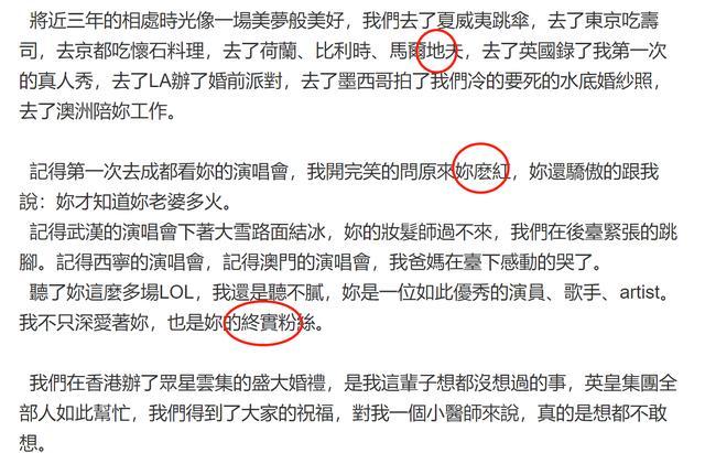 他发的千字文不但错字连篇,还记错了看演唱会的地点,同时文中把自己树立成深情的好丈夫形象,直接说是阿娇不再爱自己,他这篇长文显然没有和阿娇沟通过。我们常说好聚好散,两个人夫妻一场,作为公众人物,是不是应该多考虑对方感受?从社交平台发长文,到这次公开回应,赖弘国始终都在自私的为自己着想。