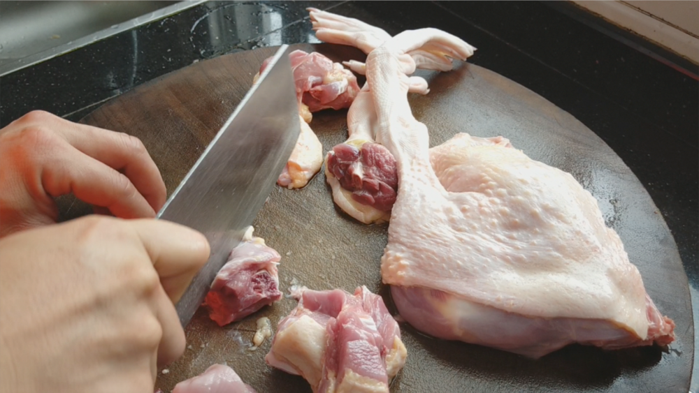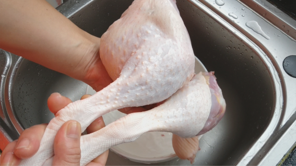 第一步:先准备两只鸭大腿,用火烤一烤皮,再刷洗干净,然后砍成小块放一边备用。