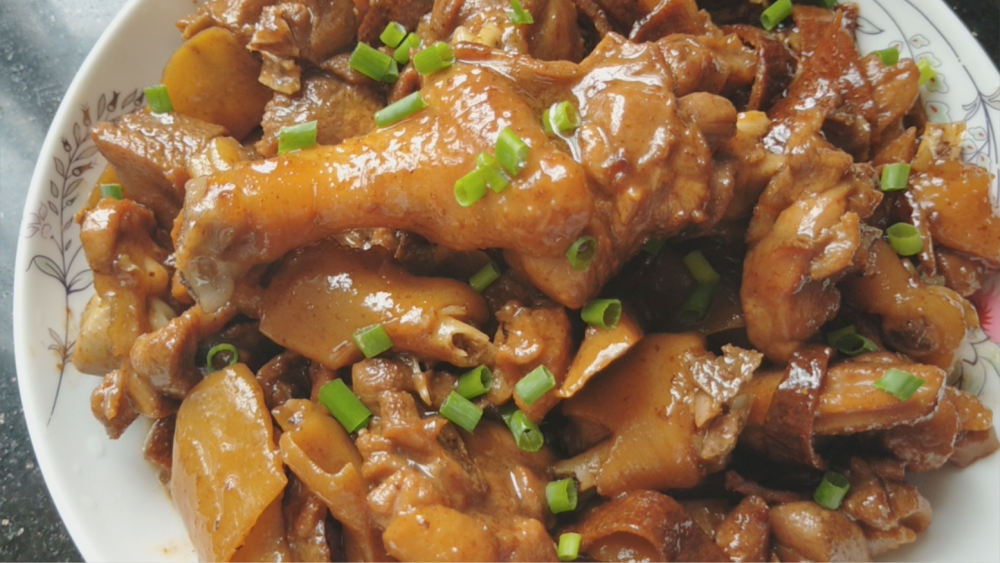 第八步:好了,汁都差不多焖干了,打开锅盖调大火把汁收一下,不要收太干哦,留少许汁,吃着口感才更好哦。好喽,关火出锅装盘,再撒上点葱花点缀一下。
