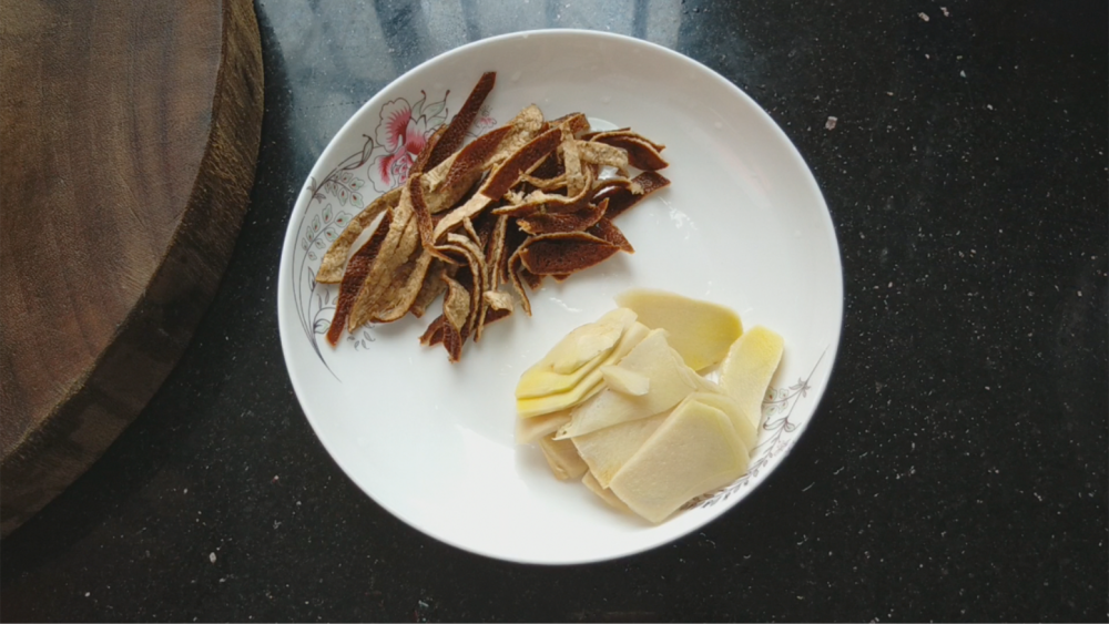 第二步:准备姜2块,去皮切片;准备陈皮3块,提前用水泡软,然后清洗干净再切丝,切好放一边备用。