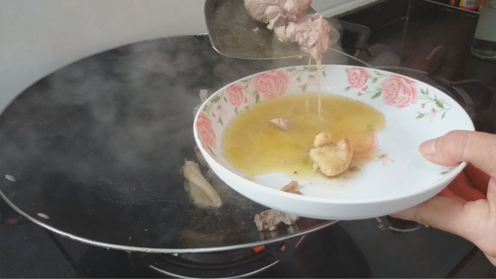第四步:炒出来的汁水盛出后,加入准备好的姜片,继续开大火翻炒,炒出香味后,加入一小杯高浓度的白酒,继续大火翻炒。