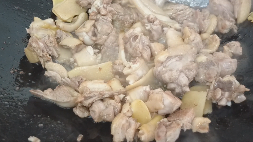 第五步:一直炒到它噼里啪啦响就可以了,然后加入适量的盐,生抽,少许的老抽上色,把它翻炒均匀,翻炒均匀后,加入适量的清水,水量大概没过鸭肉就可以了,盖上锅盖,大火焖15分钟。