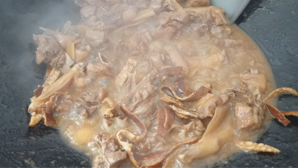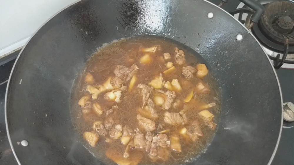 第六步:好了,焖的时间差不多了,锅中的汁也焖干了许多,我们现在把陈皮放进去,搅拌一下。