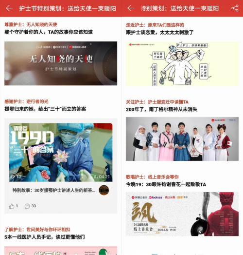 人民日报新媒体和网易云音乐、网易哒哒推出的互动H5《无人知晓的天使》,上线就刷屏。因为很多跟护士相处的场景,大家熟悉而陌生,比如去医院的患者、家属,习惯了对护士的吆喝、使唤,唯独缺乏了一份尊重、理解,引发大家的转发分享。在今年全国驰援湖北的4.2名医护人员中,护士占了2.86万人,这也印证如今护士在医护系统中已是顶梁支柱之一,他们高度谨慎的工作、连续不断的夜班、几乎没有周末节假日的随时待,承担着超越我们想象的压力。新冠疫情之下,大家重新认识了护士的辛苦和敬业,正是始终守护着我们一生中最重要的部分健康,我们才能快速击败新冠病毒,生活逐渐恢复正常。