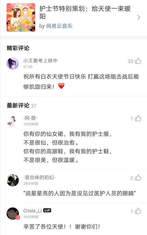 据了解,在网易云音乐搜索护士节便能进入护士节特别策划专题,丰富的内容从各自独特的角度为大家展现了护士的不同侧面,许多网友留言说:明知困难重重,他们却能挺身而出,平凡的伟大,是最温暖的天使。