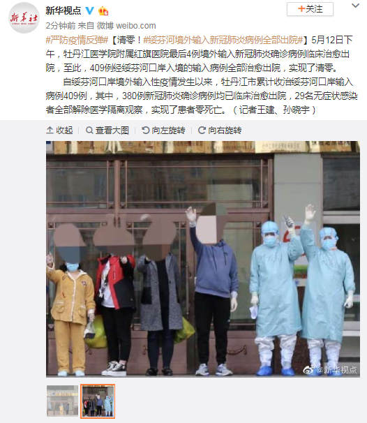 5月12日下午,牡丹江医学院附属红旗医院最后4例境外输入新冠肺炎确诊病例临床治愈出院,至此,409例经绥芬河口岸入境的输入病例全部治愈出院,实现了清零。