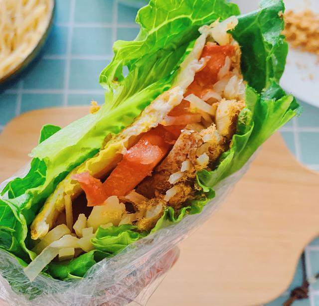 最后一步。选择一片比较大的生菜叶,将之前摆放好的馅料包住,并将上下两片生菜叶包在一起,然后压实。