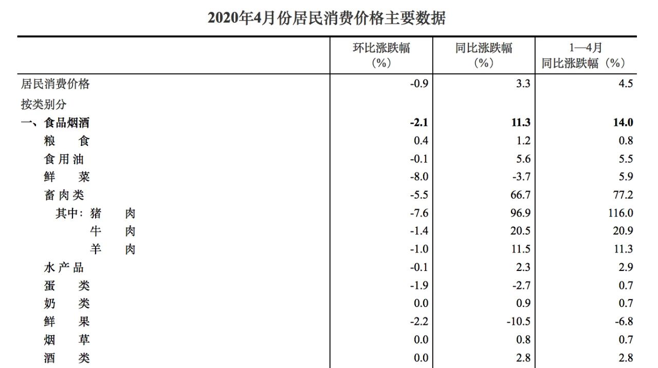 据国家统计局最新数据,2020年4月份,全国居民消费价格同比上涨3.3%。1―4月平均,全国居民消费价格比去年同期上涨4.5%。