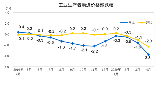 2020年4月份,全国工业生产者出厂价格同比下降3.1%,环比下降1.3%;工业生产者购进价格同比下降3.8%,环比下降2.3%。PPI 环比、同比降幅扩大。