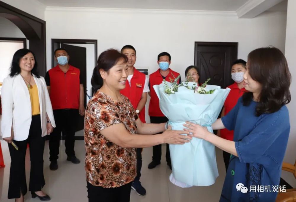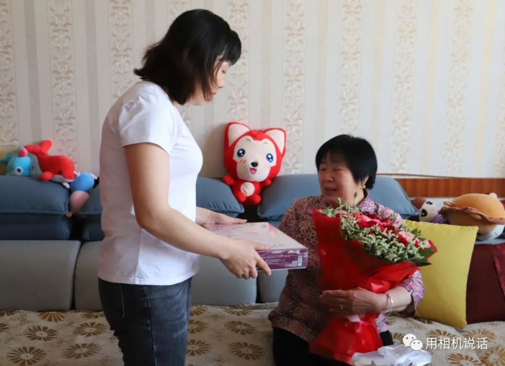 志愿者们为薛俊青和她婆婆递上鲜花等礼物,祝她们节日快乐。薛俊青也把一个写有祝福语的大蛋糕送给了婆婆,祝母亲节日快乐,一生幸福,一世如意!