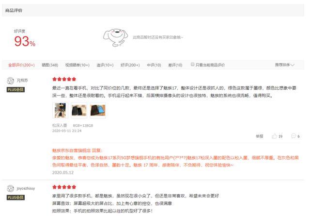 开箱细节稍后奉上,我们不如先看看第一批魅族17(不包括魅族17 Pro)用户的反馈。以重点平台京东为例,目前魅族17的好评度为93%,讲真,该数据对于一款首销的产品来说不算乐观。
