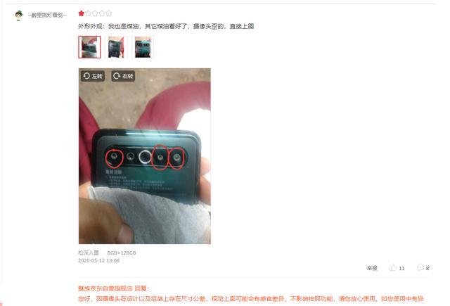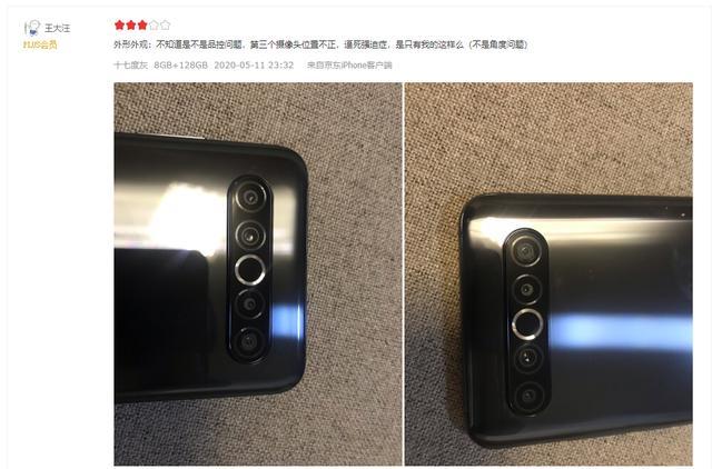 中评方面,有用户晒出了首批魅族17的其中一个问题:“第三个摄像头位置不正,逼死强迫症”。放大该买家分享的图片,第三颗摄像头确实有一种“斗鸡眼”既视感……好吧,其实类似问题并非个案,苹果iPhone也出现过前摄偏移的问题,但后者也支持官方维修/更换。