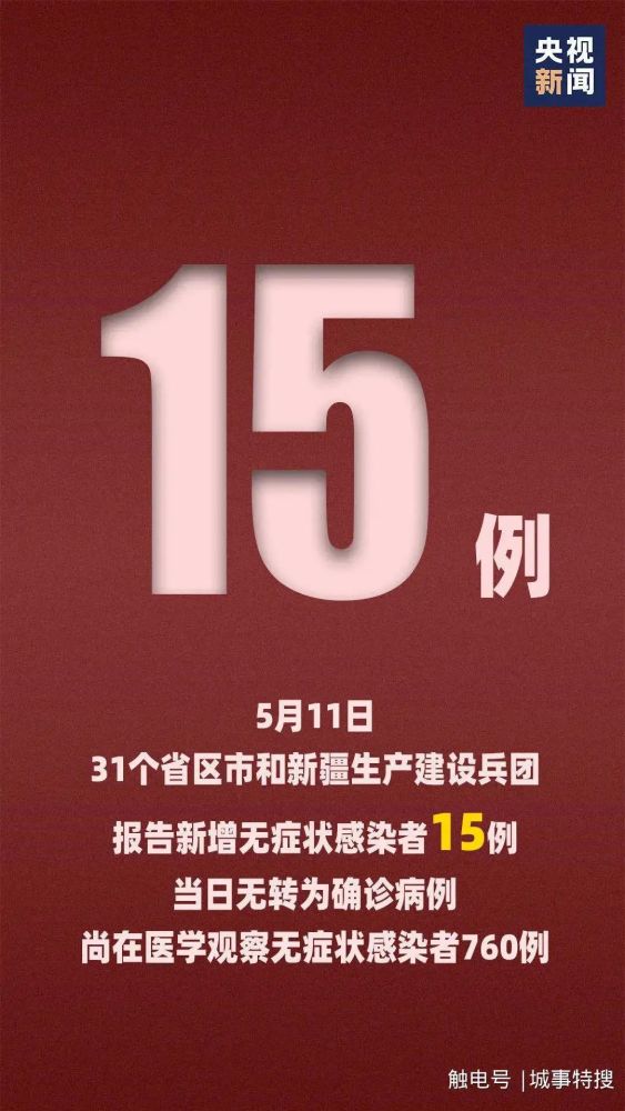 31个省(自治区、直辖市)和新疆生产建设兵团报告新增无症状感染者15例(无境外输入);当日无转为确诊病例;当日解除医学观察35例(境外输入6例);尚在医学观察无症状感染者760例(境外输入38例)。