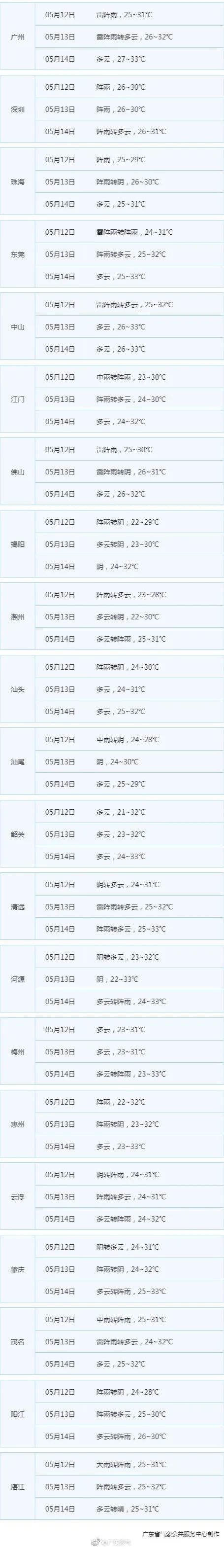 14日-15日,全省大部多云,粤北和珠三角的部分市县有分散(雷)阵雨。最高气温:雷州半岛、河源、梅州、珠三角大部33℃~35℃、部分市县36℃~37℃,其余大部分市县31℃~33℃。