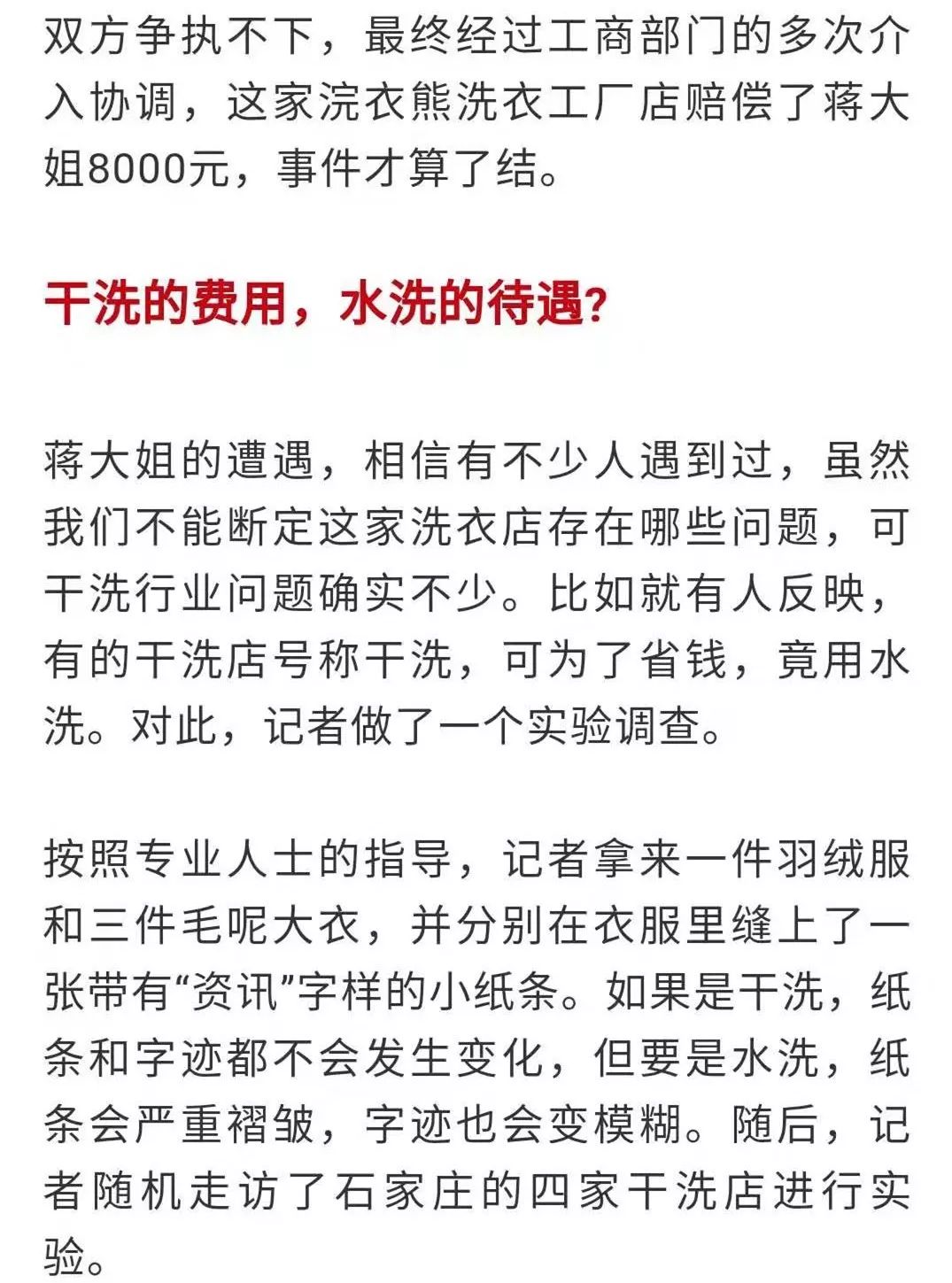 燕赵都市报 来源:澎湃新闻 问政春天来了,天气暖和了,不少人会把在家不方便清洗的羽绒服、皮衣、羊绒大衣等送到洗衣店清洗。那洗衣店会按照正规流程给我们洗衣服吗?