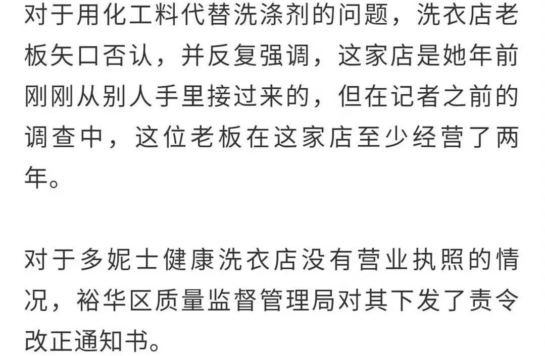 节目播出之后,石家庄裕华区质量监督管理部门经过调查取证后,对位于石家庄市尖岭小区的多妮士健康洗衣店进行了现场查封。
