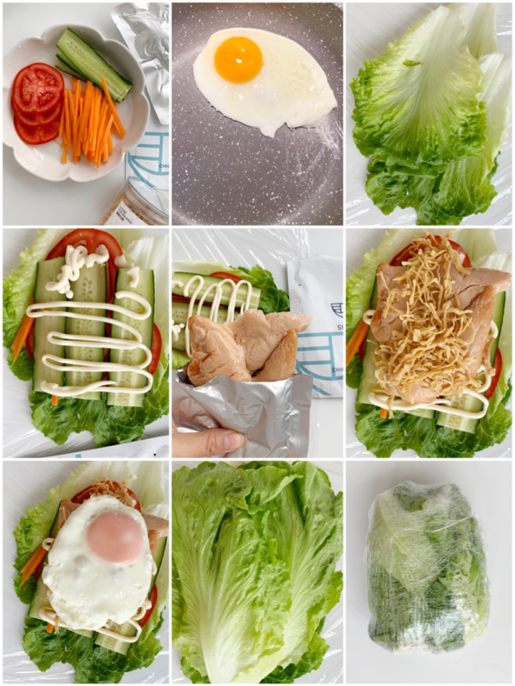 然后依次码上西红柿,胡萝卜,黄瓜,挤上低脂沙拉酱,再放即食鸡胸肉和肉丝,最后码上鸡蛋,盖上最后两片生菜~
