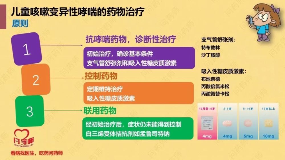 医生会根据孩子的病情轻重、临床类型、发作规律、年龄大小等因素选用不同剂型、甚至不同剂量的吸入激素。因此,建议家长把这么专业的事情交给靠谱的呼吸科医生或者哮喘门诊的专科医生。
