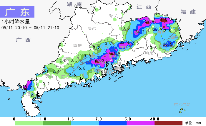 5月11日下午,华南沿海多地的激烈天气相当猛烈,在冷暖空气的激烈对撞之下,大量雷雨云形成了一道强飑线,所到之处全部狂风暴雨,电闪雷鸣。据广东气象局数据,梅州蕉岭出现了1小时121毫米的猛烈暴雨,同时不少地方在短短一小时内就达到了大到暴雨级别,雨势相当凶猛。
