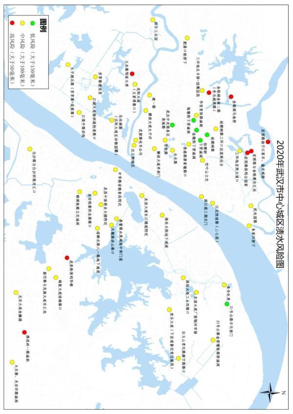 结合今年雨情及排水设施情况,武汉市水务部门修订了渍水点风险图。运用数据模拟分析,中心城区(含东西湖区)主次干道共有59处易渍水(风险)点。其中,高风险渍水点8处,中风险渍水点45处,低风险渍水点6处。