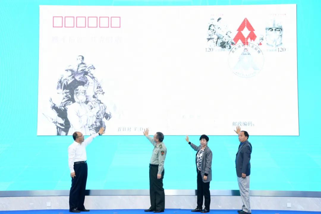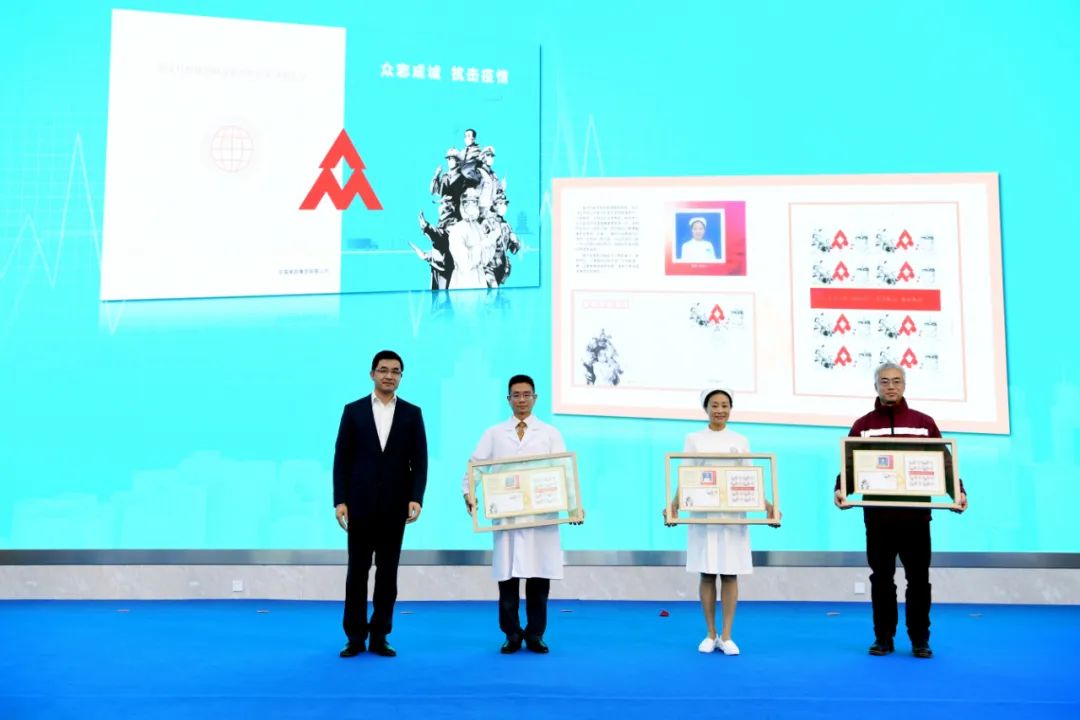 杨传堂、梁言顺、马军胜、李斌、梁惠玲、刘爱力、张金良共同为邮票揭幕,中央军委后勤保障部卫生局副局长徐勤耕、财政部经济建设司一级巡视员宋秋玲、中国人口福利基金会副理事长武家华、康宁共同为邮票首日封揭幕。刘爱力向中国红十字会总会捐赠抗击疫情慈善款,张金良向北京医院呼吸与危重症医学科副主任许小毛,北京大学人民医院护理部护士长赵彦,中国疾控中心驻黄冈检测队队长、病毒病所曾毅院士实验室副主任张晓光三名抗击疫情医务工作者代表捐赠邮折。